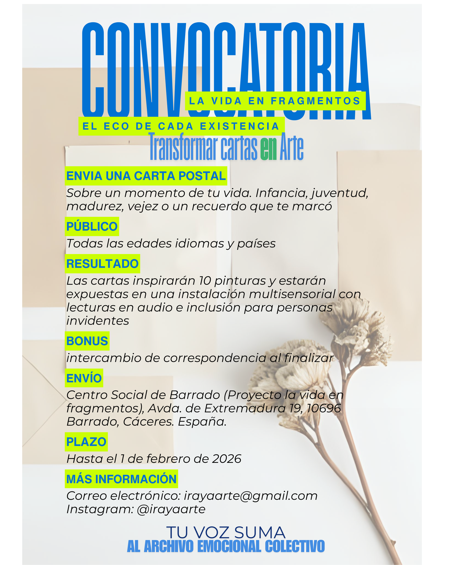 ¿Alguna vez has sentido que tu historia merece ser escuchada? ¿Que tus vivencias, emociones y recuerdos forman parte de algo más grande? El proyecto artístico “La vida en fragmentos. El eco de cada existencia”, creado por la artista IRAYA, nace precisamente de ese deseo: reunir voces, miradas y experiencias de personas de todo el mundo a través de un medio íntimo y casi olvidado… la carta postal.